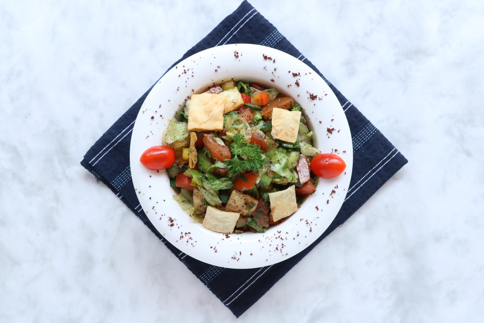 Charcoal grilled eggplant with fresh herbs, garlic, tomato, mixed pepper, pomegranate sauce, onion, lemon juice and olive oil.